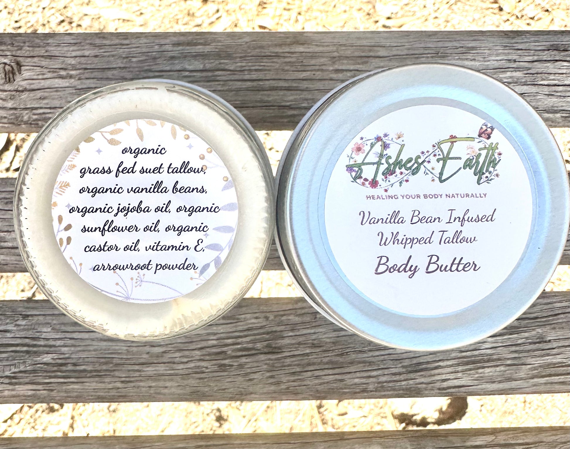 Organic Grass Fed Suet Tallow Infused with Madagascar Vanilla Bean. Ingredients include Organic Jojoba Oil, Sunflower Oil, Castor Oil, Vitamin E, and Arrowroot Powder. All ingredients are organic with no fillers or preservatives as always.